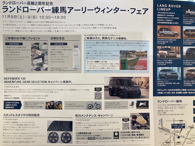 11月8日(土)と11月9日(日)の2日間のイベントになりますので、是非LANDROVER練馬へお越しくださいませ🫡